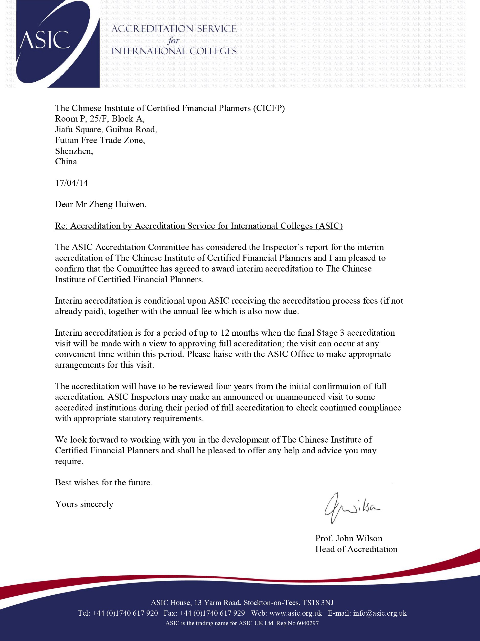 理财师课程获得英国国际院校认可委员会Accreditation Service for International Colleges (ASIC)认证证书