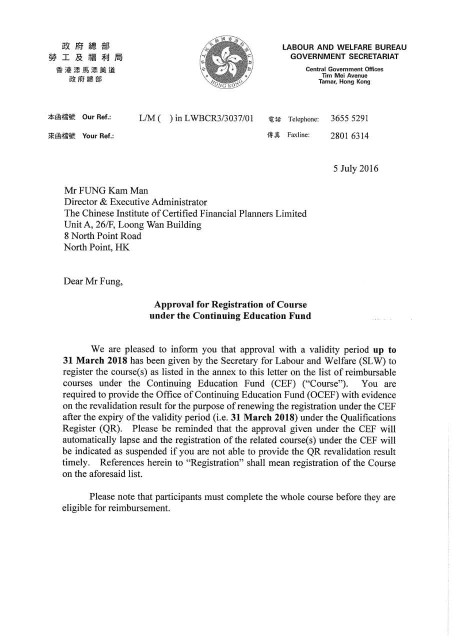 证书课程被香港政府总部劳工和社会福利署列入持续进修基金计划